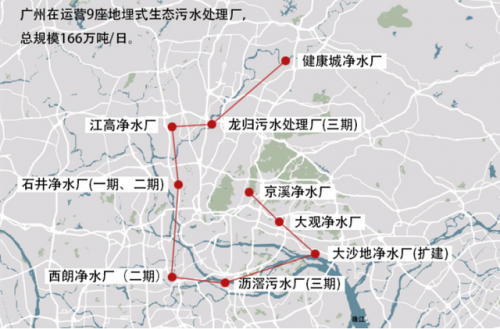 從2010年建成全國首座地埋式膜處理工藝凈水廠——京溪地下凈水廠、2018年初建成全市第二座采用地埋式構(gòu)造的污水處理廠——石井凈水廠(一期)到如今,廣州中心城區(qū)累計(jì)建成地埋式污水處理廠9座,呈北斗狀分布于珠江兩岸,被譽(yù)為“地下北斗9星”。9座地埋式污水處理總產(chǎn)能181萬噸/日,占廣州中心城區(qū)污水處理總產(chǎn)能的三分之一,占全國同類污水處理模式總產(chǎn)能規(guī)模的五成以上。