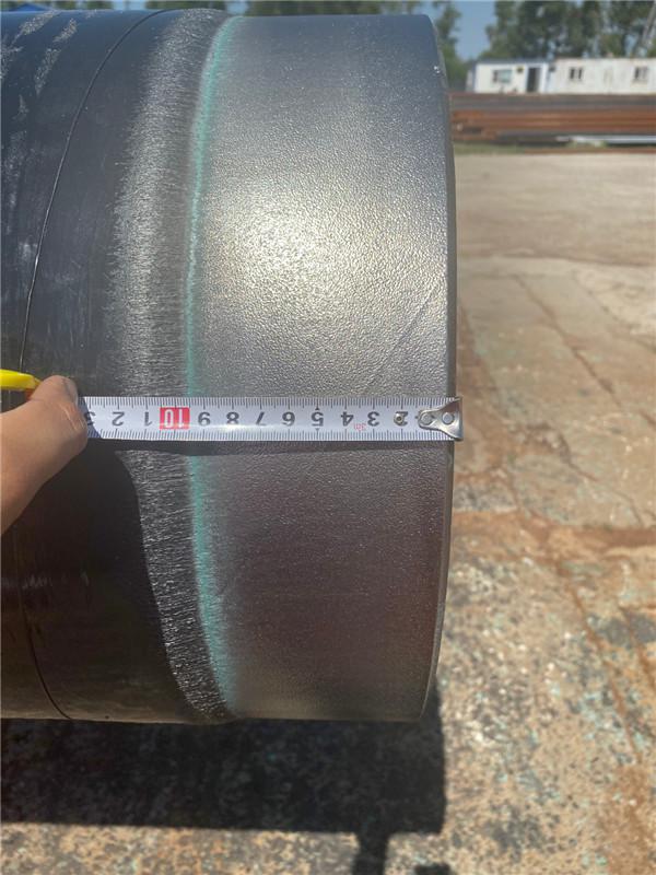 聚乙烯層包覆后,用水將鋼管冷卻至溫度不高于60℃。涂敷環氧粉末至對防腐層開始冷卻的間隔時間應確保熔結環氧粉末涂層固化完全。采用循環水冷卻,啟動前應檢查循環水泵是否完好,節約用水。防腐層外觀采用目測法逐根檢查;聚乙烯層表面應平滑,無暗泡、麻點、皺折及裂紋,色澤應均勻;使用磁性測厚儀測量鋼管圓周方向均勻分布的四點的防腐層厚度,其結果應符合SY/T0413-2002《埋地鋼質管道聚乙烯防腐層技術標準》表2.0.2的規定;防腐層的漏點采用在線電火花檢漏儀檢查,檢漏電壓為25kV,漏點檢測在涂層溫度低于90℃時進行;通過采用端頭清理裝置除去管端部位的聚乙烯層,管端預留長度應為100mm~150mm,按甲方要求和產品外觀美觀,統一預留100mm且聚乙烯層端面應形成小于或等于30°的倒角;管端處理合格后的鋼管在管體的兩端纏繞隔離繩,防止鋼管之間在運輸、倒運過程中互相碰撞,損傷表面防腐材質。經質量檢測合格的防腐管,粘貼產品標簽和質量合格證,并按同規格,同型號堆放在一起;合格品吊裝時采用寬度為150mm~200mm的尼龍帶或膠皮帶或用吊鉤掛鋼管的兩端,嚴禁用鋼絲繩直接作用于防腐層表面進行吊裝作業;吊裝過程中輕起輕放,行走平穩,嚴禁磕碰拖拉而損壞保護層;儲存場地設置管托和隔欄,管托應高150mm;儲存區應懸掛銘牌,銘牌上應標明鋼管規格、數量等;裝卸、倒運防腐管時,采取保護措施,不得損壞防腐層。